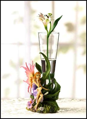 Purple Fairy with Orchid Vase - A delicate pastel-clad fairy and softly shaded orchids