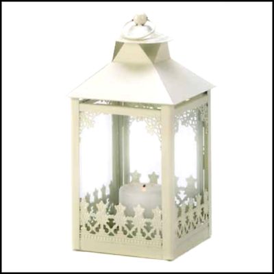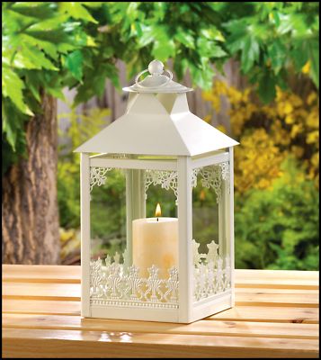 Garden Gate Candle Lantern Lacy ornaments create a lovely picket-fence effect on all sides of this off-white candle lantern, lending it a uniquely nostalgic charm. Simply place your favorite candle inside and let the warm and comforting glow light up your night with a hint of vintage romance! Weight 1.7 lbs. Iron and Glass. Candle not included. 4 3/4" square x 9 3/4" high.