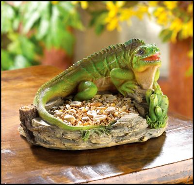 Green Iguana Birdfeeder A grinning green reptile keeps a close watch on his bounty of birdseed, saving it for the very bravest visitors. Lifelike iguana adds a
