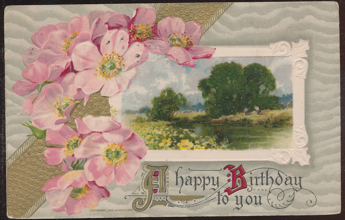 vintage postcard Birthday Greeting Colorful Scene Winsch Floral embossed