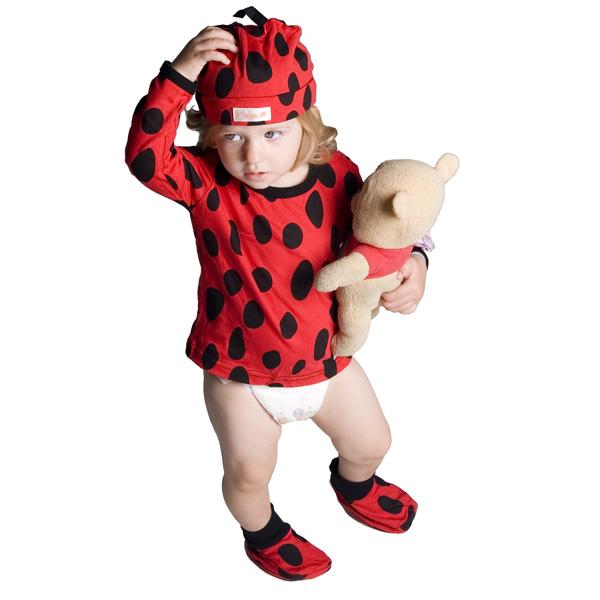 Description: This NOO Designs Baby LADY BUG Outfit is just great for your little one who wants to laze about all day! Endeavoring to bring FUN back into children's clothing NOO Designs' garments & accessories are made from 100% Cotton & hand dyed for superior quality using colourfast dyes so fun prints will not ruin in the wash! Comfy & adorable this Lady Bug Outfit is ideal for AM or PM wear can be worn together or as separates! Baby Lady Bug Gift Set includes Hat Booties Long Sleeve T-Shirt and Pants/Leggings! All these essential pieces arrive in their very own matching little carry bag.