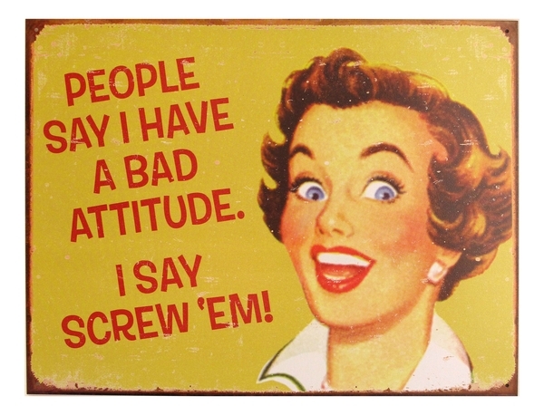 Tin Sign Bad Attitude/People say I have a bad attitude, I say screw 'em, Size 16"H X 12.5"W - holes punched in each corner with folded edges.