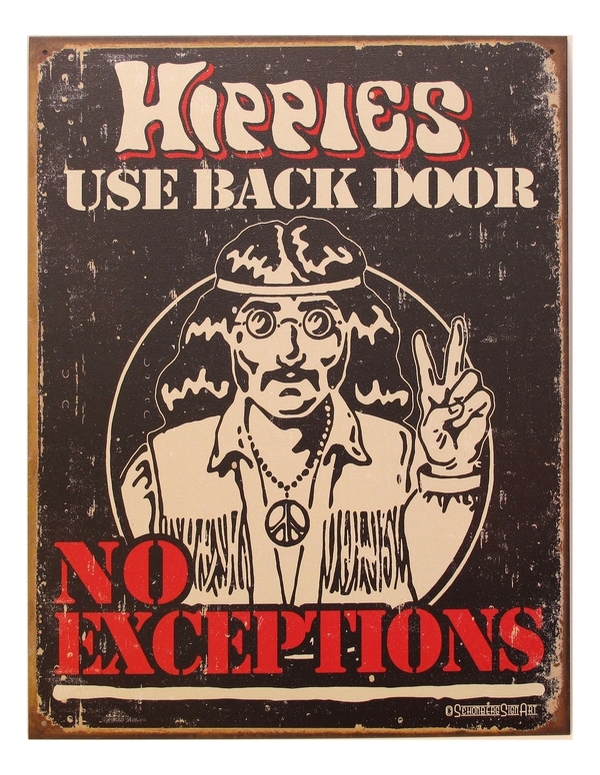 Tin Sign Hippies use back door- no exceptions, Size 16"H X 12.5"W - holes punched in each corner with folded edges