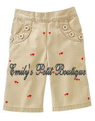 These are a pair of Tulip Pants from Gymboree's Holland Days Line. They are beige with little red tulips all throughout the pants. The pockets are outlined with 3 large buttons.