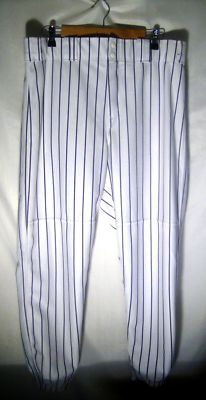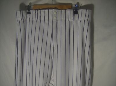 You are viewing a pair of purple pinstripe on white baseball pants. The waistband is 2.25" with wide belt loops. 2 button snap closure with a zip fly. The waist measures 37", Inseam 28.5".