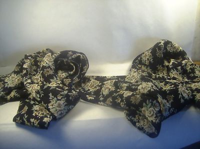Your are viewing a 5' foot long navy chiffon type scarf with bouquets of cream/tan flowers and sage green leaves. Great career wear. Good condition. No rips, tears or frayed edges.