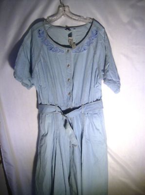 Button front, shirtwaist, with darker blue embroidered trim around the neck. There is gold colored top stitching outlines. The buttons are silver colored metal.