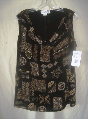 The top is black with brown, tan and white geometric and leaf designs. The neckline is draped.