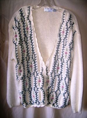 The sweater has scalloped edges at the neck and hem. Crewel embroidered pink roses and green leaves with blue/gray designs.