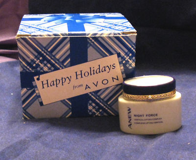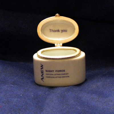AVON REPRESENTATIVE HOLIDAY GIFT PORCELAIN TRINKET BOX Remember when little trinket boxes were all the rage? Avon representatives received this lovely little hinged box shaped like a jar of Anew Night Force Vertical Lifting Complex! Gray jar with blue letters and lid and silver accent. Inside of lid has "Thank You" printed in blue letters. Bottom has printed inscription: "Designed exclusively for Avon Representatives December 1999" Approx. 2 1/2" high and 1 1/2" square. Padded box is approx 4" square and 3 1/2" high. Item is used (removed for display). Made in China.