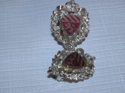 VINTAGE SILVERTONE CLIP ON EARRINGS. THEY ARE UNIQUE! THE HAVE A CROWN ON TOP AND A SHEILD IN THE MIDDLE. GOOD CONDITION FOR AGE. THEY ARE 1 1/4" TALL AND 1/2" WIDE.