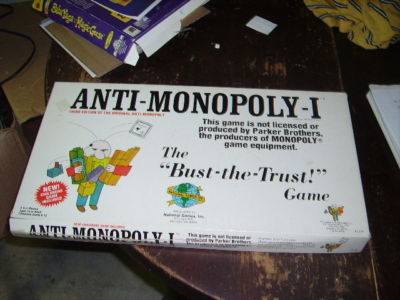 ANTI-MONOPLOY GAME by Ralph Anspach from 1973. This is the first version of this game before the law suit by Milton Bradley. Condition: the game components are in excellent condition it looks like the game was played sparingly id at all. Most of the money and all the cards are still attaches to each other. The box is in very good condition as well but there is some staining to the box top probably visible from the scanYour goal in this game is to break up the monopolistic groups you see on the board in front of you. For example: Fort Auto, Crystal Auto, and General Auto are three big companies belonging to the Auto group that have worked out a system to keep prices high and competitors out of the market. This is illegal, but they are getting away with it- unless you and other trust-busting lawyers in the game can stop them. The trustbuster who does the best job of enforcing the law against monopolies wins. This player’s score is the total number of social credits earned, plus the amount of budget money he/she has left when the game end.