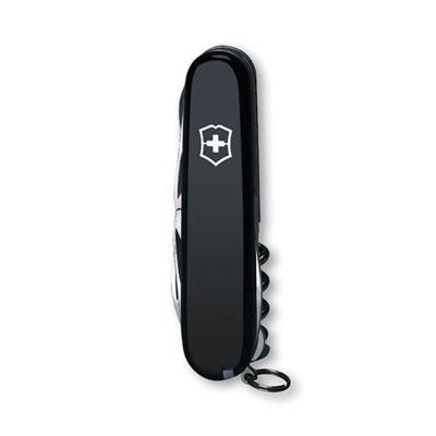 Large blade Small blade Can opener with small screwdriver Bottle opener with large screwdriver & wire stripper Scissors Reamer with sewing eye Corkscrew Hook Toothpick Tweezers Key ring