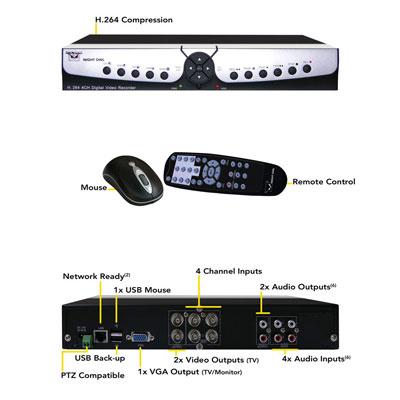 4 Channel H.264 Smart DVR (No Hard Drive); D1 Recording; Digital Watermarking Video Time and Date Stamped for Official Use; Play Back All Channels at once; Viewable Anywhere in the World via Internet Explorer; Viewable on your 3G/ 4G Smartphone; Motion Activated Recording and Email Alerts; Simple Point and Click Interface (Mouse Included); USB Back Up; Connects Directly to your TV (RCA) and/or Monitor (VGA); Night Vision Up to 30 feet; No Monthly Fees; Professional Installation Services Available Nationwwide; 24/7 Technical Phone Support