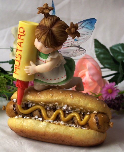 Kitchen Fairy "Mustard on Bratwurst" - This adorable Kitchen Fairy is helping add the mustard to everyone's favorite summertime bratwurst. Specifications UOM : EA length : 4in, height : 4.75in, materials : Stone Resin
