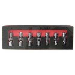 Set includes: 3/16", 1/4", 5/16", 3/8", 7/16", 1/2" and 9/16" flex sockets.