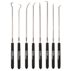 Set includes the following: 90° pick, straight pick, complex pick, hook pick, combination pick, double angle pick, 45° pick and angle hook pick.
