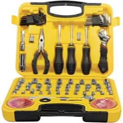 Set inlcudes: 3/8” drive reversible ratchet, SAE and metric sockets and accessories, pliers, adjustable wrench, screwdrivers, magnetic bit driver, assorted hex bits, hex key wrenches, and heavy duty case for organized storage.
