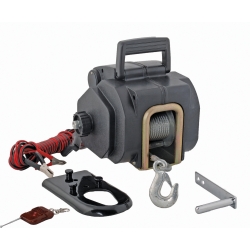 This automotive winch has the rolling capacity of 11, 000 lbs. It comes with a wireless remote control, power lead and remote switch for safe operation. Also includes a 30' winch cable with attached hook, a mounting bracket for trailer hitch ball mounting and emergency crank handle with adjustable clutch.