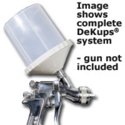 DeVilbiss DeKups® is a disposable cup system that replaces the use of traditional metal spray gun cups. The DeKups® system eliminates the cost and labor associated with cleaning metal cups increasing painter productivity and reducing solvent usage. The DeKups® system also eliminates the need for mixing cups and paint cans. The system is comprised of a disposable lid and liner that fit into a reusable frame. A mixing guide attaches to the side of the reusable frame and there are adapters to fit most spray guns. Filters fitting into the adapter allow for paint filtering during spraying. Available self venting funnels allows for refilling of the system.