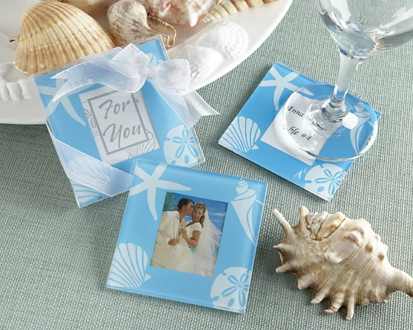 Charmingly adorned with enough starfish seashell and sand dollar accents to remind your guests of the beach yet elegant enough for your most sophisticated event the Summer Glass Coaster delivers solid glass construction with a variety of functions. Use them for coasters (of course) but let them do double duty as photo frames as a placecard holder or simply to tell your guests "For You" with its pre-printed card. Coasters measure 3.5" x 3.5" (with an insert size of 1.75" x 2") and come gift-packaged with a lovely organza ribbon and bow. Each favor contains a set of two coasters.