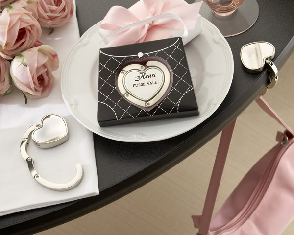 Some things a girl just can't live without! Whether it's fora bridal shower or a girls' night out! Cute and compact the CompactHeart Purse Valet is a female's best friend because it protects thoseprecious items in her purse while she enjoys herself. This pretty andpractical "heart" is a handy little favor! Features and facts: Purse Valet is made of sturdy chrome Heart rests on tabletop and expanding hook extends under the table Stylish black-and-white gift box resembles a quilted purse with a white-satin ribbon handle Back of box illustrates how the purse valet works Compact Heart Purse Valet measures 1 3/4" w x 1 1/4" h Gift box measures 3 1/2" w x 2 3/4" h x 1/2" d