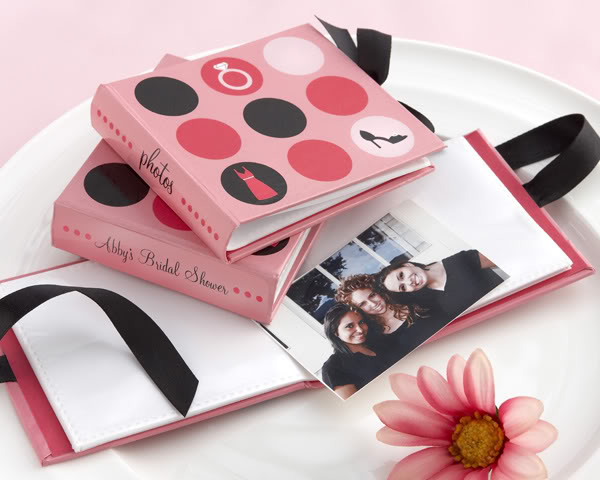 Once again Kate Aspen designers emerge with a fun favor for your next bridal shower girl's night out or other all-female festivity where photos are taken and memories are made! Features and facts: Dainty dots in black and shades of pink on a pink background hold icons of the female world an engagement ring a chic dress a purse lipstick a sexy stiletto shoe and a yummy Cosmopolitan in a glass Photo album is crafted from heavyweight glossy paper with clear-plastic photo inserts The album holds one dozen 3" x 2 3/4" photos Album is accented with a black grosgrain bow that keeps the album closed when not in use Photo album measures approximately 4" h x 3" w x 3/4"