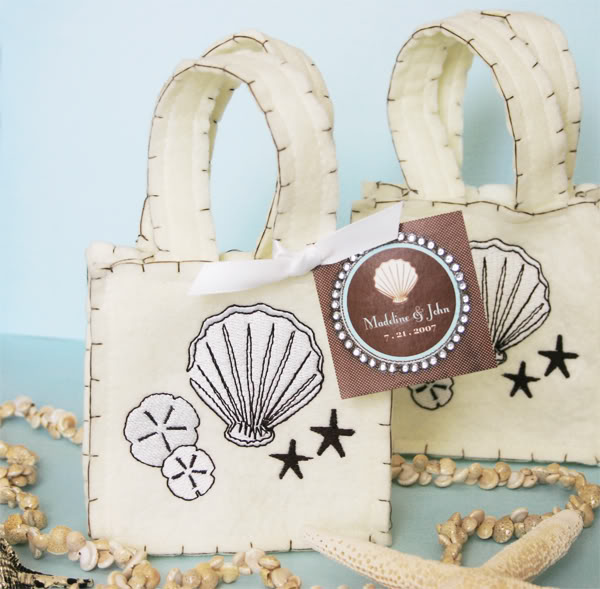 Seaside events call for seaside treats! Choose your favorite beach theme goodies to put inside and let the bag say the rest. Even the simplest gift you put inside will lookperfectly packaged and match your seaside theme. This beautiful ivory colored felt bag is embroidered with seashells, starfish and sand dollars... just the right combination for agift from the sea! Fill them as you wish for guests to enjoy. Personalized Tag sold separately. Size: 4" x 6.5" with handle.