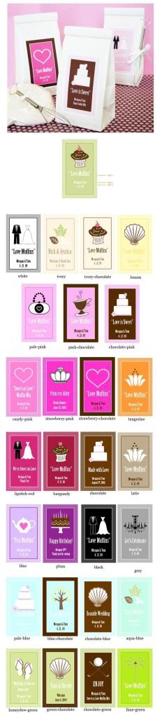 Nothing spells lovin' like muffins from the oven! This endearing gift "bakes" a warm and delicious favor for your guests. Personalization is included. Just select from an assortment of pics to find the theme design that's just right for you. Then choose the perfect color, add you names, wedding date and personal message for a truly custom wedding favor that is all your own! Try labeling your Muffin Mix favors with our favorites such as "Love Muffins" or "Love is Sweet", etc. Create the perfect gift by pairing these personalized mixes with our optional heart handle mini whisk. Optional whisks come with a white satin bow and a heart shaped handle that has a small opening so you can easily slip it through a hole. Some assembly required (punching a hole in the muffin mix package and slipping the heart handle of the whisk through it.) Each white gloss pouch contains 6 oz. of Gourmet Sweet Muffin Mix (makes approx. 4 muffins). Directions are printed on the back. Personalized labels come unattached from the Muffin Mix. Due to the personalization for this product the minimum order is 24. Processed on equipment handling wheat, egg, dairy, and tree nut ingredients. Size: 6.5" x 3.5" Design Options