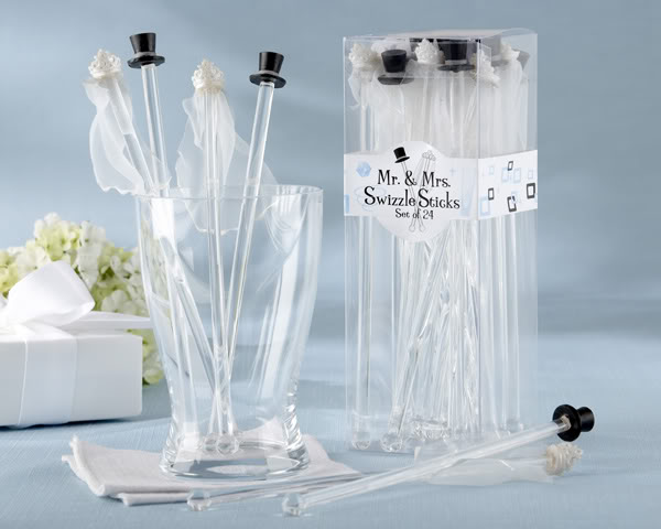 When you drink to the happy couple do it in "down the aisle" style! Dress up drinks and stir up a good time at the engagement party the rehearsal dinner and the reception with "Mr. & Mrs." Swizzle Sticks. The swizzle sticks come dressed up as top hats and tiaras with veils leaving no doubt why you're celebrating. These 6 3/4"-high swizzle sticks are so cute and clever your guests just might consider them favors and take them home to remind them of the fun they had that wonderful night! Sold in sets of 24.