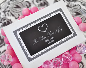 As you walk down the aisle on your wedding day, and also during the toasts, heartfelt moments are bound to make your guests cry tears of joy. Help your guests dry those eyes with our stylish "Tears of Joy" Personalized Tissue Packs. Each chic pack of 7 tissues comes encased in a white folder personalized with your own thoughtful wishes. We suggest personalizing the packs with a message like "For Your Tears of Joy" along with the bride and grooms name and the wedding date. For a special touch place a few in a basket by the entrance or lay one tissue pack on each seat for guests to use during the ceremony.