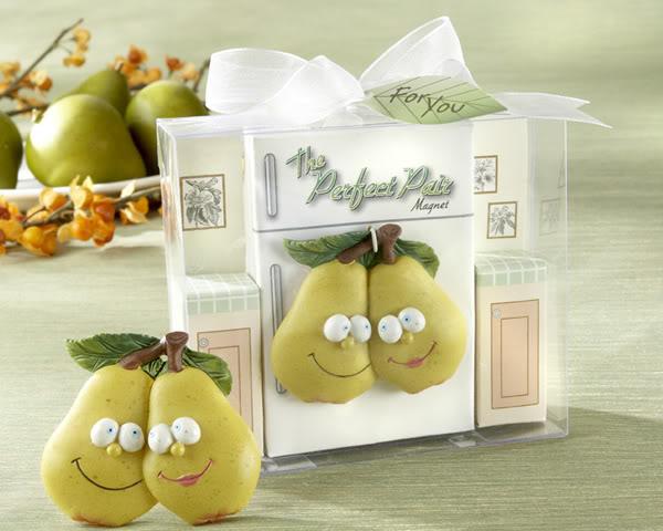 Opposites may attract but "The Perfect Pair" Refrigerator Magnet is certain to draw rave reviews from your guests! Beaming with the look of love the colorful resin pair brings a breath of fresh air to anyone's kitchen including their own. They're right at home in a comfortable kitchen setting cuddling happily on their refrigerator all displayed in a clear gift box that measures 4.5" x 3.75" topped with a sheer organza bow and a leaf-design "For You" tag. A fanciful favor created by Kate Aspen to attract the attention you deserve on your special day!