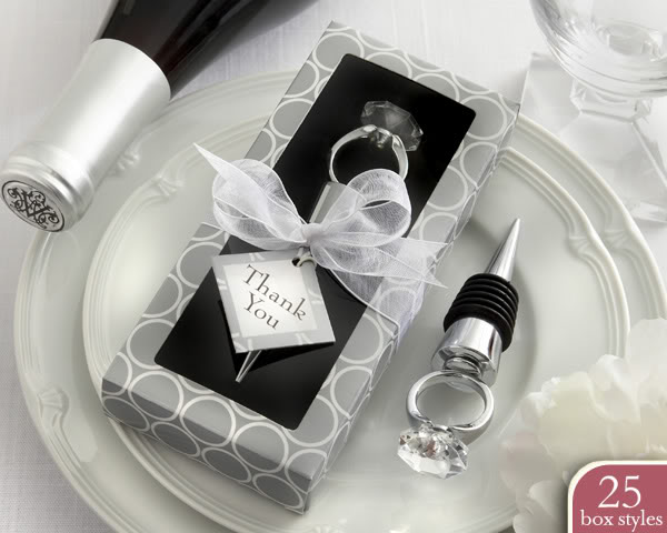 You know that feeling you get when he's on his knee and opens the ring box? Wedding guests will get that same rush of excitement when they open this gift box to find what else? An engagement ring sitting atop a bottle stopper! A simply breathtaking favor! Features and facts: Crafted from solid chrome Bottle stopper is 4 1/2" long Choose one of Kate Aspen's Personality Boxes in 25 styles and 25 colors Matching "Thank You" tags are included with each favor Matching personalized tags (coordinated with Personality Box) are available for an additional charge Bottle stopper sold in sets of four
