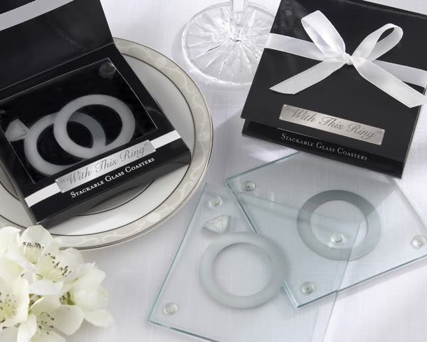 One a symbol of promise the other a symbol of eternal love and together an engagement ring and wedding ring show the world you and your groom will share a life forever. As soon as your wedding guests lift the top on these meaningfuluniquely packaged glass coasters they'll not only know what's in your heart they'll be reminded often. Features and facts: Silver engagement ring design on one coaster silver wedding ring on the other each ring offset to create exquisite ensemble when stacked Both glass coasters include plastic "feet" to protect surfaces Coasters measure 3 1/2" square Contemporary black gift-box has flip-up cover that reveals coaster set through clear display window Gift box accents include shiny white grosgrain ribbon and bow along with the words "With This Ring" and "Stackable Glass Coasters"