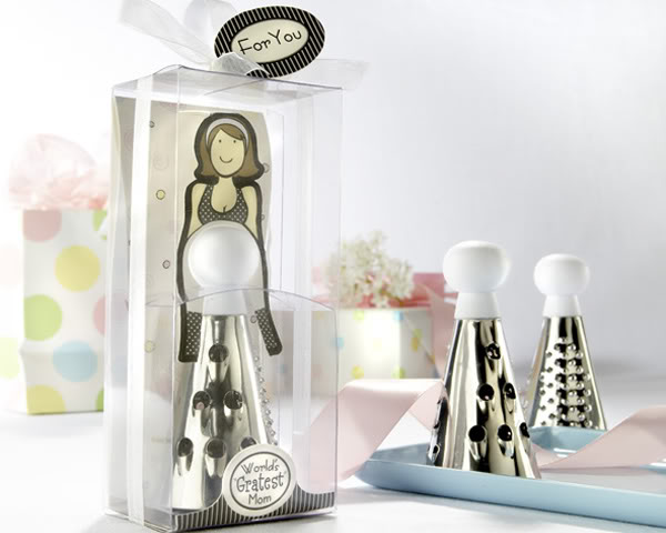 Though millions of moms throughout the world are great tell your new mom she's "grater!" These merry moms in their cheese-grater "dresses" will dress up your baby shower tables delightfully and surprise your guests with their originality and charm. Standing in front of a colorful backdrop the cute cardboard cutout of "mom" appears to have a "baby belly" that's actually the white handle of the stainless-steel cheese grater which features three hole sizes for fine and coarse grating. One of Kate Aspen's most whimsical designs this baby shower favor is beautifully displayed in a clear gift box that says "World's Gratest Mom" all accented by a lovely sheer organza bow and a "For You" tag. The grater measures 3 1/2" high and the display gift box measures 51/2" x 2 1/2" x 2". Click here to view tag designs