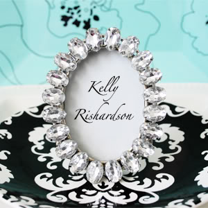 Invite guests to be seated in style! Attractively cut acrylic jewels are carefully set on these beautiful Antique Place Card Frames. Glamorous weddings deserve to be "framed" with elegance. These beautiful frames are made with metal and large acrylic beads to give a glitzy antique look. Personalization not included. Size: 2.9" x 3.7"