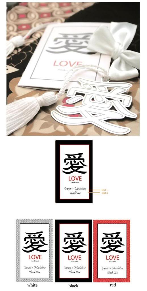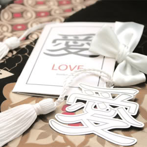A practical gift for any Asian themed event - a stunning stainless steel bookmark carved into an ancient Chinese symbol for LOVE. Guests will be transported to the memory of your exquisite wedding each time they pick up their favorite book. Each silver colored love symbolcomes in its very own shimmery white book shaped folder with a white satin ribbon closure. Bookmarks are strung to a white tassel that dangles from the top of each folder. The cover of each folder is marked with the Chinese love symbol as well as the it's translation "LOVE" in English just below. When proclaiming love in two different languages, you can be sure that it's a message that won't be missed! And here's an idea - try slipping in this unique bookmark along with your save-the-date cards to make sure guests "mark" the date. Size: Bookmark - 2.5", finished folder - 2.75" x 4.25". Matching personalized labels are available for $0.25 per label when ordering 24 or more of this item. Max. Characters per line (including spaces): Line 1: 16 Characters Line 2: 16 Characters