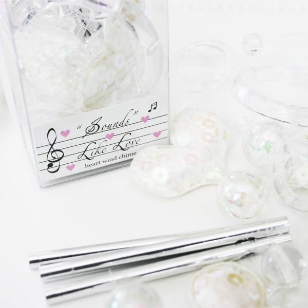 Let the delightful jingle of our "Sounds Like Love" Heart Wind Chimes entrance your guests on your wedding day. These wonderful chimes will serenade their hearts with a soothing melody. Your guests will be pleased to add this thoughtful thank you gift to their porch or garden and enjoy its rhythmic sounds on peaceful summer days. Ornately detailed hearts with sequins are suspended between iridescent beads that catch light and sparkle in the sun. Each pre-assembled wind chime is packaged neatly in a clear box with white satin bow labeled "Sounds Like Love". Size of Packaging: 1.75" x 3.5" Size of hanging wind chime: 11" length