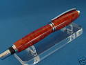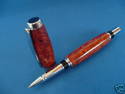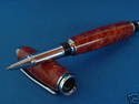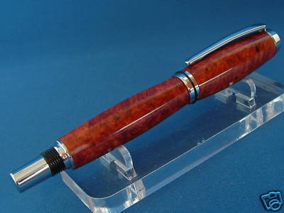 This is a beautiful new writing instrument from Bill's Talented Turnings. The pen pictured is the pen you get. This pen is called a Baron Chrome Rollerball Pen. This pen is made from a beautiful highly figured piece of Exhibition Quality Amboyna Burl. It has burl eyes and figure 360 degrees around the pen. I hand turned the pen on the wood lathe in my studio workshop. The wood is finished with several coats of CA Glue. This is the toughest, long lasting finish I have been able to find. The wood will stay bright and shinny for many years. I have personally carried a pen with this type of finish in my pocket for 4 years and the wood is just as shinny as the day I made it. This pen is a great conversation piece and truly a piece of art. The pen pictured is a rollerball pen. It comes suppied with one quality German rollerball black ink cartridge. Refills are readily available at office supply stores..