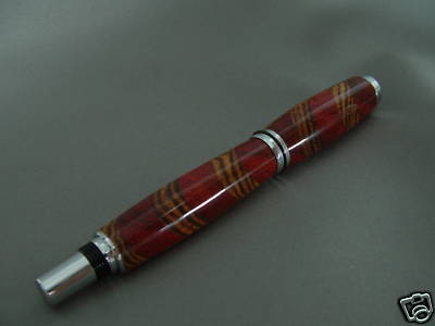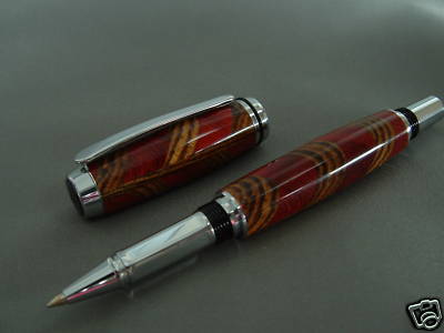 This is a beautiful new writing instrument from Bill's Talented Turnings. The pen pictured is the pen you get in this auction. This pen has several species of exotic wood segmented together and it is then turned on the wood lathe in my studio workshop. This is a great conversation piece and truly a piece of art. The pen pictured is a rollerball pen with black ink.
