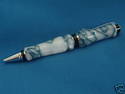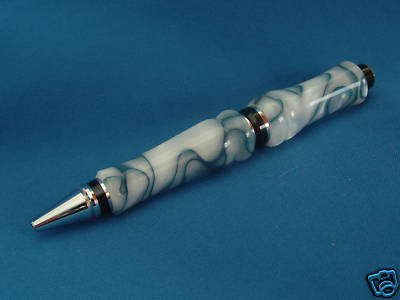 This is a beautiful new writing instrument from Bill's Talented Turnings. The pen pictured is the pen you get in this auction. I turned this Chrome Cigar pen in my studio workshop. The Pen is made from a piece of blue and white pearlescent acrylic. The acrylic has been turned to a shape that is comfortable to write with. The acrylic has been polished to perfection. I turn each one of my pens one at a time. This pen has a distinctive, elegant design in the nib, center band and finial ring that carry over onto the robust clip and finial top It is a larger pen that takes Parker ballpoint or gel ink that is readily available at most office supply store. This pen comes supplied with a Parker style ballpoint ink. It would make a fine gift for any occasion or a fine writing instrument to add to anyone's collection. I guarentee that you will be satisfied with this pen. .