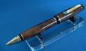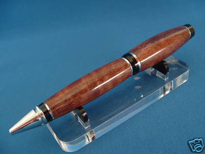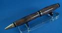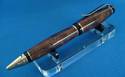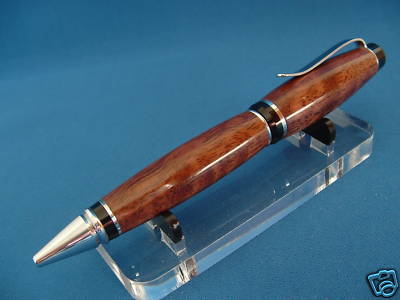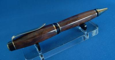 This is a beautiful new writing instrument from Bill's Talented Turnings. The pen pictured is the pen you get in this auction. I turned this Gold Cigar pen in my studio workshop. The pen is made from a beautiful piece of Figured Walnut wood. I finished the pen with CA glue which is the toughest finish I have been able to find. The finish on the wood will stay bright and shiney for many years. It is almost indestructable. I have personally carried a pen with this type of finish on it for 4 years and the finish on the wood is just as good as the day I made the pen. I turn each one of my pens one at a time by hand so each pen is one of a kind. This pen has a distinctive, elegant design in the nib, center band and finial ring that carry over onto the robust clip and finial top It is a larger pen that takes Parker ballpoint or gel ink that is readily available at most office supply store. This pen comes supplied with a Parker style ballpoint ink. It would make a fine gift for any occasion or a fine writing instrument to add to anyone's collection. I guarentee that you will be satisfied with this pen. .