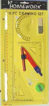 "Drawing / Math - 8 piece set. Includes: ruler, compass, protractor, eraser, 2 triangles, sharpener, pencil." Case Pack 48