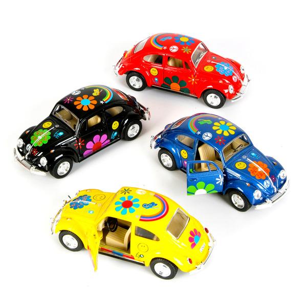 "A classic calling card to the generation of peace, love, and flowers. These Volkswagen Beetle replicas feature a Flower Power design scheme and doors that open. When you pull them back, they race forward at high speeds. Assortment of colors may vary. Each" Case Pack 12