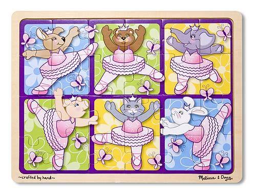 "Dancing animals and butterflies are ""in the pink"" on this ballet-themed puzzle. Get ready to stretch your child's puzzle solving abilities with this 24-piece wooden jigsaw puzzle. Comes packaged in a sturdy wooden tray for puzzle building and easy storage."