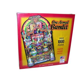 "One-Armed Bandit 1000 Piece Puzzle. Here's a slot machine with a colorful payoff! Put together this challenging 1,000-piece puzzle and treat yourself to a one armed bandit filled with fantastic detail. Study it and you'll find chorus dancers, a limo, a bottle of champagne and much more. It's another whimsical work from artist Lewis T. Johnson." Case Pack 6