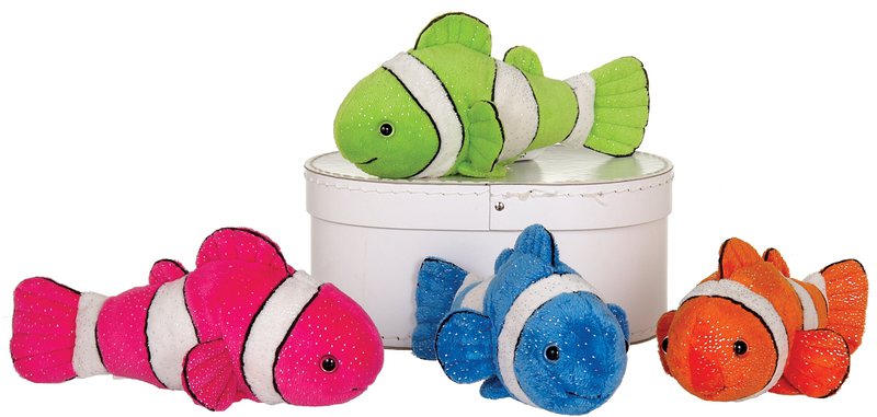 "9"" 4 Assorted Glittered Clown Fishes: pink, green, blue, and orange." Case Pack 72