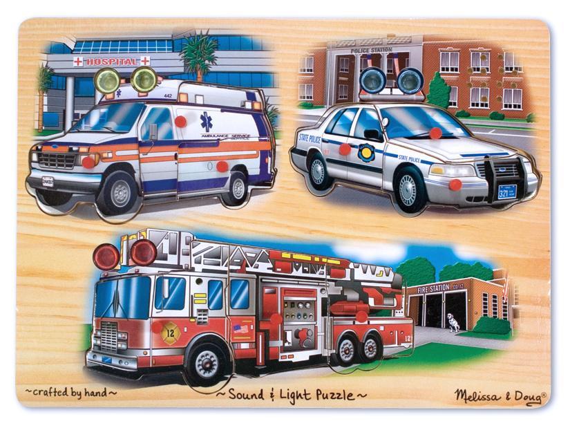 Place the last puzzle piece into the emergency vehicle to see the lights flash and hear the sirens. This 9-piece wooden peg puzzle features three 3-piece emergency vehicles. With a full-color, matching picture under each piece, it