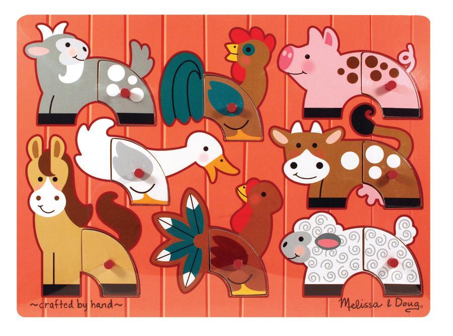 This wooden peg puzzle, featuring favorite farm animals, includes eight interchangeable pieces, allowing children to make different farm animals every time! Encourages eye-hand, fine motor and creative expression skills.