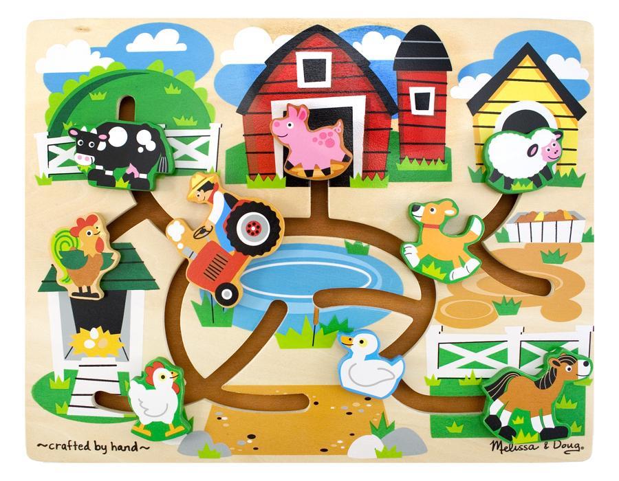 This innovative wooden puzzle includes nine adorable farm-themed pieces that slide around a farmyard on slotted tracks. Uniquely designed sliding pieces move freely around the puzzle, but can
